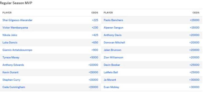 11月2日,ESPN公布新賽季MVP賠率,亞歷山大最高,文班亞馬第二,約基奇第三!